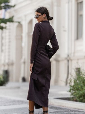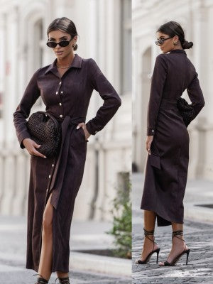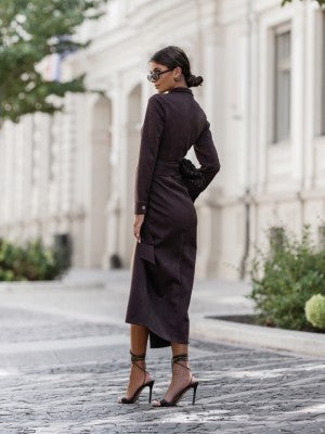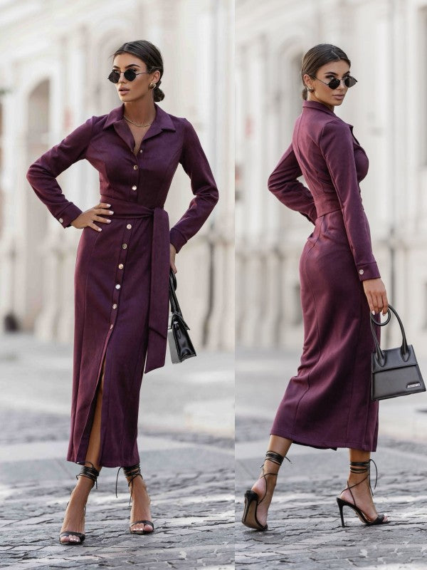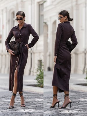 • Zmysłowe detale: Kołnierz, mankiety, pasek i subtelne rozcięcie dodają sukience charakteru.