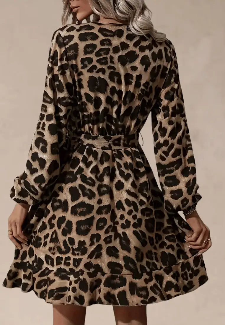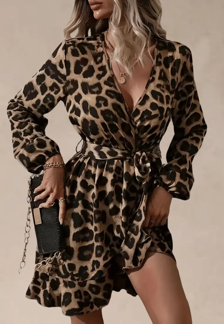 Izabela | Brązowa sukienka panterkowa kopertowa z falbaną i długim rękawem
