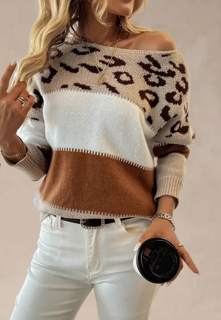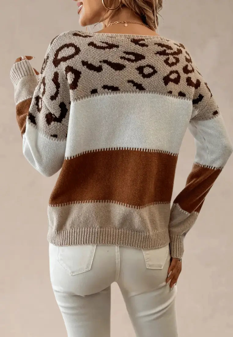 Beżowo-brązowy sweter Karolina łączy w sobie ponadczasowy wzór panterki z szerokimi pasami w ciepłych odcieniach. Miękka, przyjemna w dotyku dzianina otula ciało, a luźniejszy fason zapewnia komfort i swobodę ruchów.