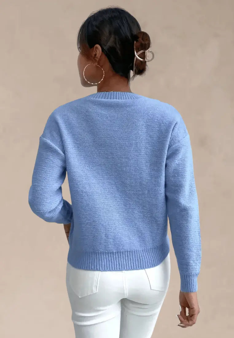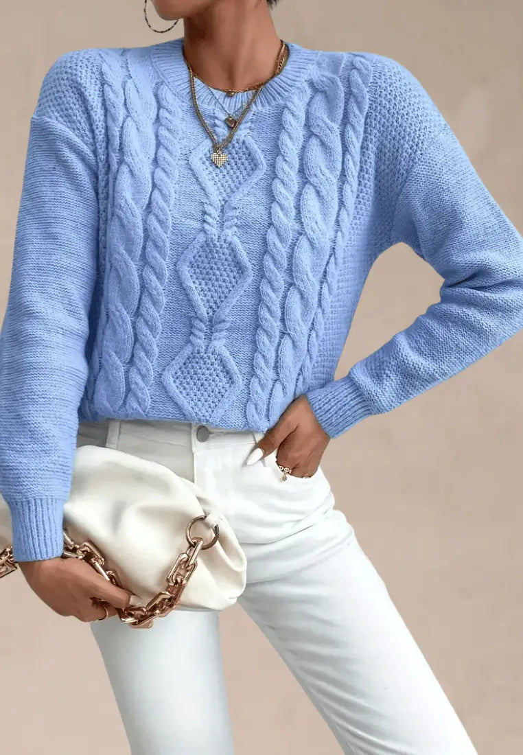 Lena | Błękitny sweter damski z warkoczowym splotem i okrągłym dekoltem