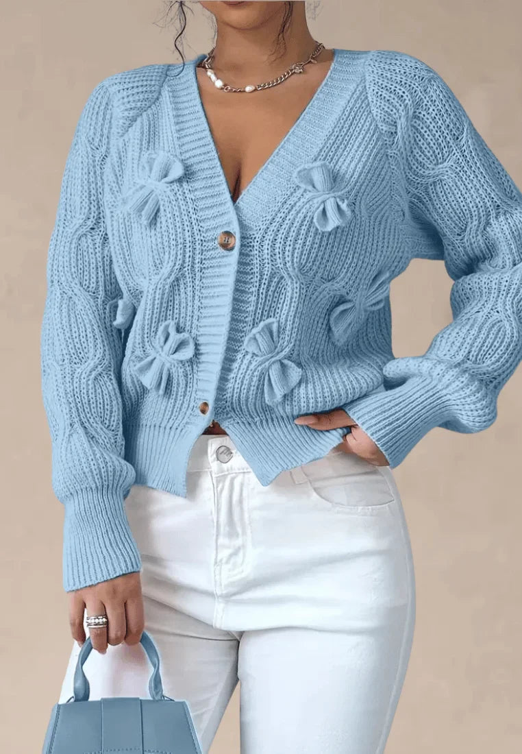 Model: Błękitny kardigan damski z kokardkami i guzikami