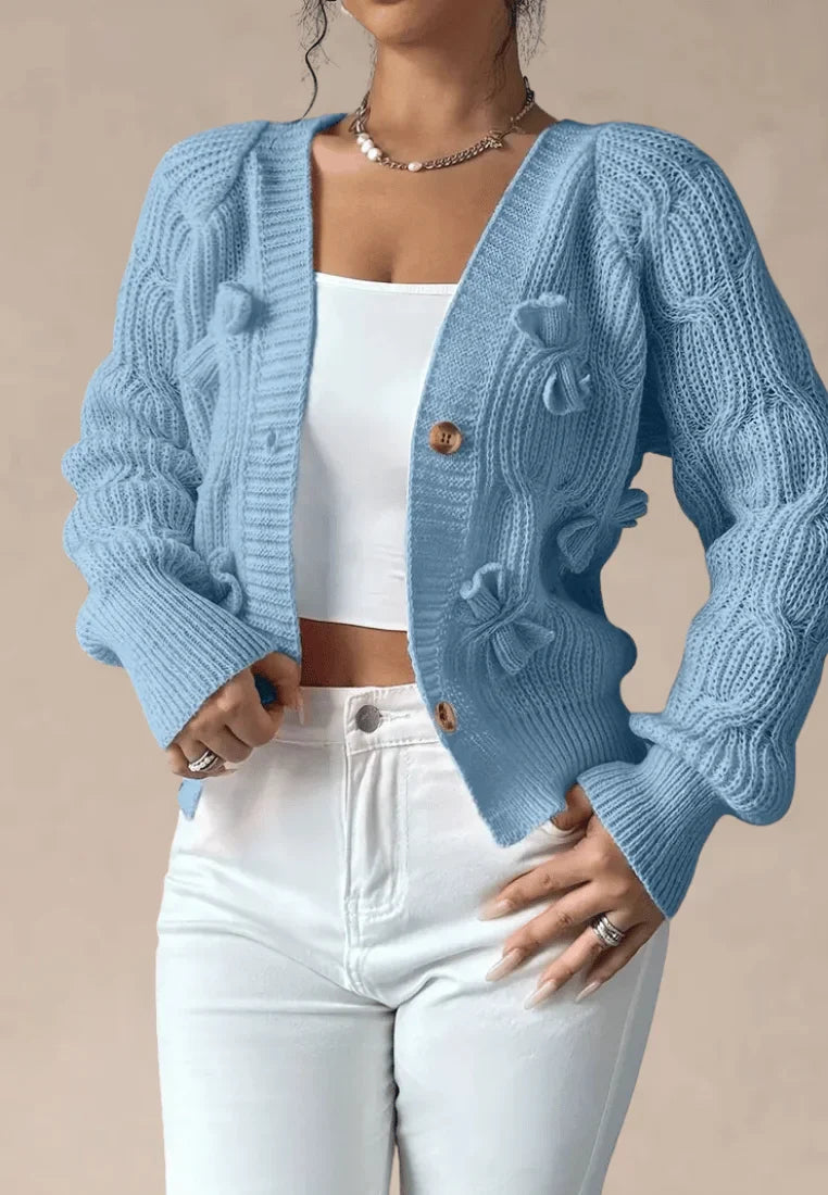 Milena | Błękitny kardigan damski z kokardkami, guzikami i krótkim fasonem