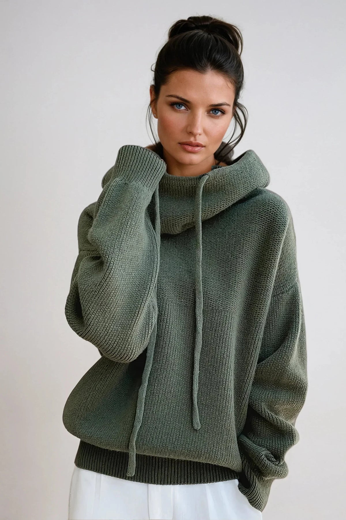 Ten damski sweter z szerokim kapturem i wysoką stójką to idealne połączenie wygody i nowoczesnego designu. Miękka dzianina otula ciało, zapewniając komfort w chłodniejsze dni, a luźny, oversize’owy krój nadaje stylizacji modnego, nieformalnego charakteru. To sweter, który możesz nosić zarówno w domu, jak i na co dzień — zawsze wyglądając stylowo i czując się swobodnie.