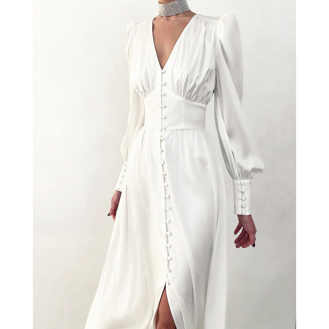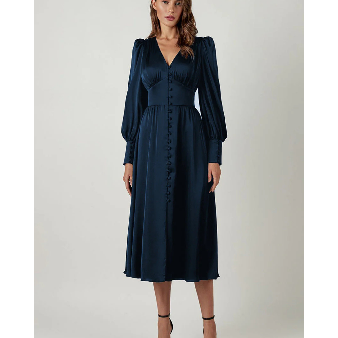 Sukienka Zanira powstała z myślą o kobietach, które cenią elegancję, ponadczasowy styl i komfort. Długie rękawy lampion dodają szyku i wyjątkowego charakteru, a dekolt w serek subtelnie podkreśla kobiecą sylwetkę. Materiał pięknie układa się podczas ruchu, dzięki czemu każda Twoja chwila staje się pełna uroku.